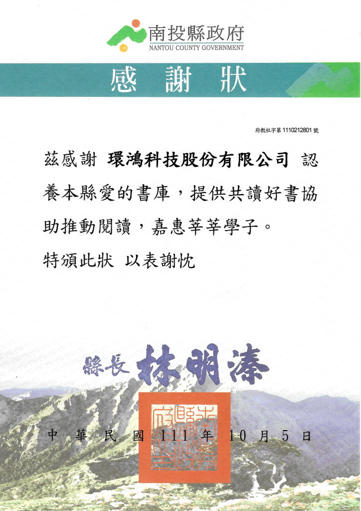 2022南投縣政府感謝狀–愛的書庫 (臺灣廠) (AG真人)