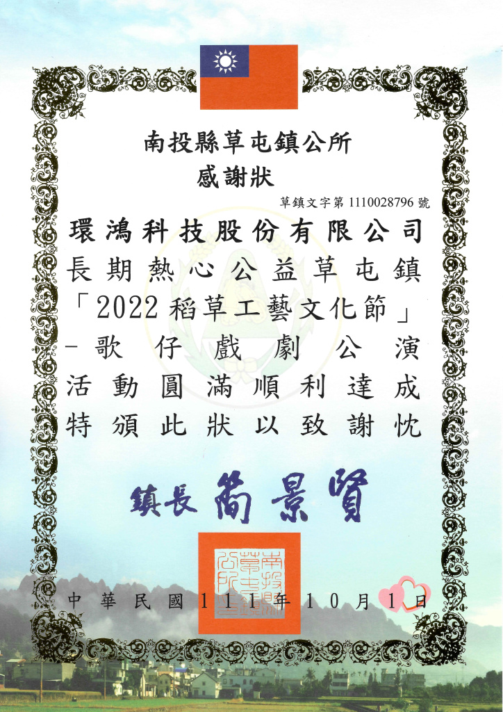 2022南投縣草屯鎮公所感謝狀–稻草工藝文化節 (臺灣廠) (ag真人百家乐官方)